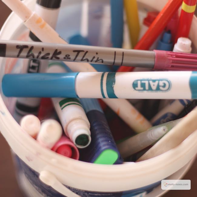Just take out the middle felt-y bit and put it in a cup of water. Depending on the felt tip pen and the age of your child, you might need a bit of help. Some are easier to get into than others. (I’ve even resorted to pliers at times.) My kids like peeling off the outside plastic bit and pulling out the nib to make sure they get as much colour as possible but it’s not really necessary.