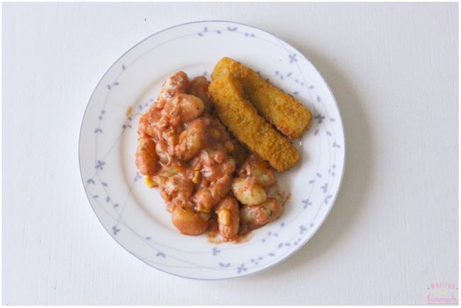 I use shop bought gnocchi, with a simple tomato and vegetable sauce and some fish fingers.
